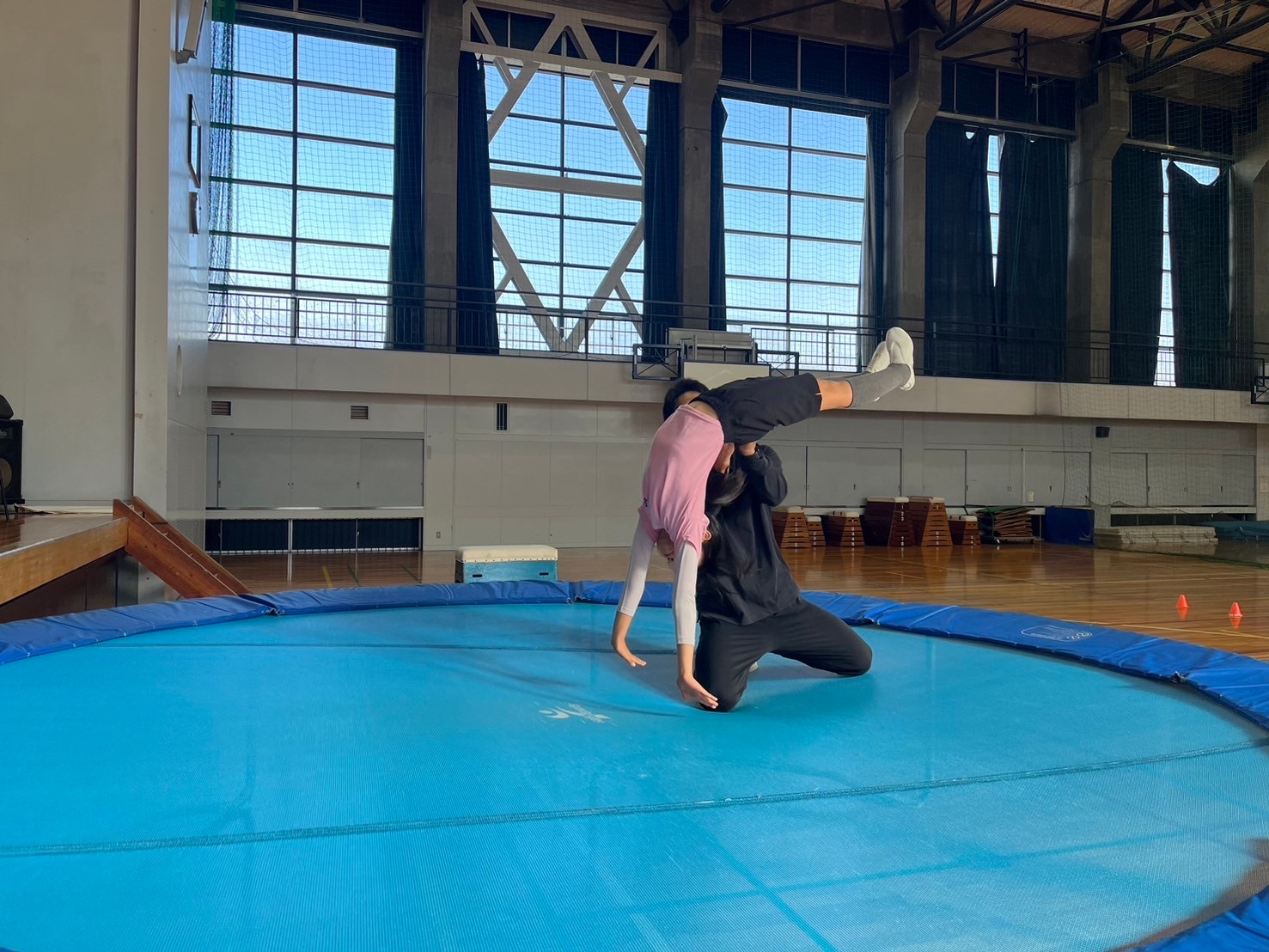 毎週大型トランポリンの練習や週替わりに学校体育で学ぶマット運動・跳び箱・鉄棒の4種類を体操クラブで行なっています。基礎的な技から始めますが、一人ひとりに合わせた成長速度で練習を行なっています。