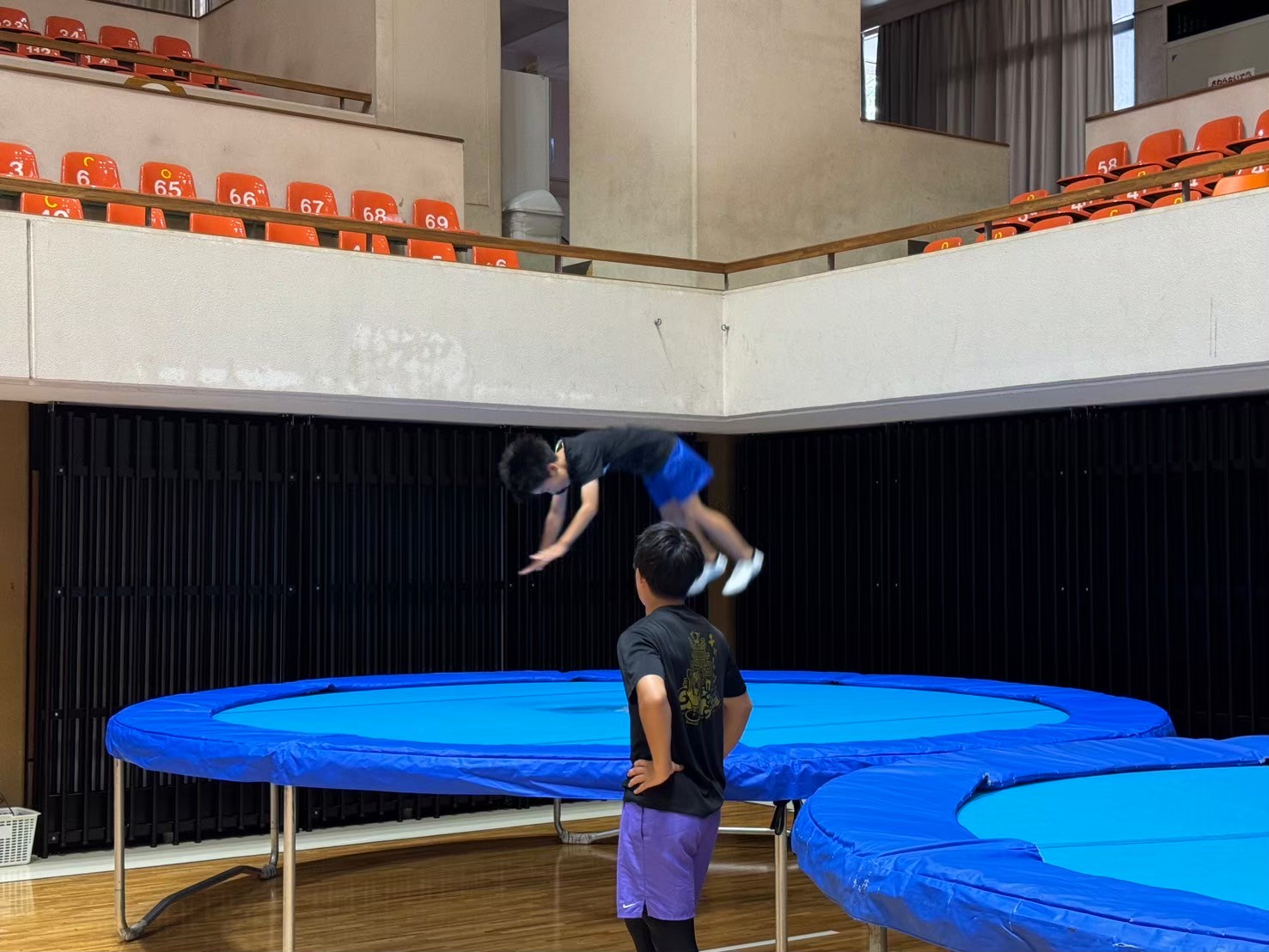 市毛体操クラブです。メリハリをつけて練習をすることを日々伝えながら指導しています。トランポリンを利用しているので、楽しみながら運動に取り組むことが出来ます。