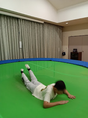 巨大トランポリンを体育館に出し、体幹を鍛えながらいろんな技に挑戦し、鉄棒・マット・跳び箱の技にも取り組んでいます。