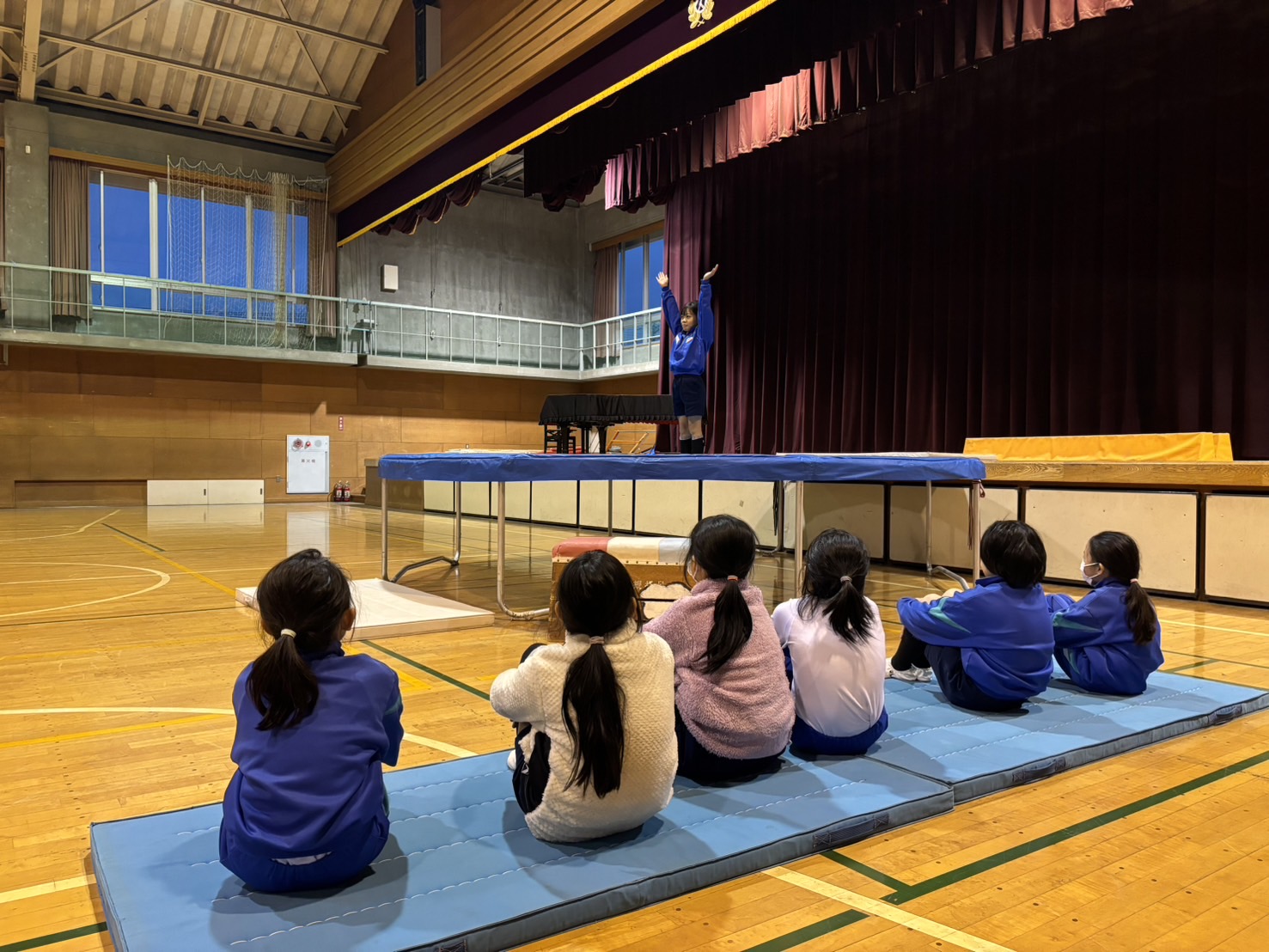私たちは、松山第一小学校の体育館をお借りし体操を行っています。近隣の小学校や幼稚園から通ってくれているお友達もいるので、小学校が違う場合でも問題なく参加できます。運動が得意なお友達、苦手なお友達、どちらも大歓迎です。お子様のレベルに合わせて練習を進めていきます。