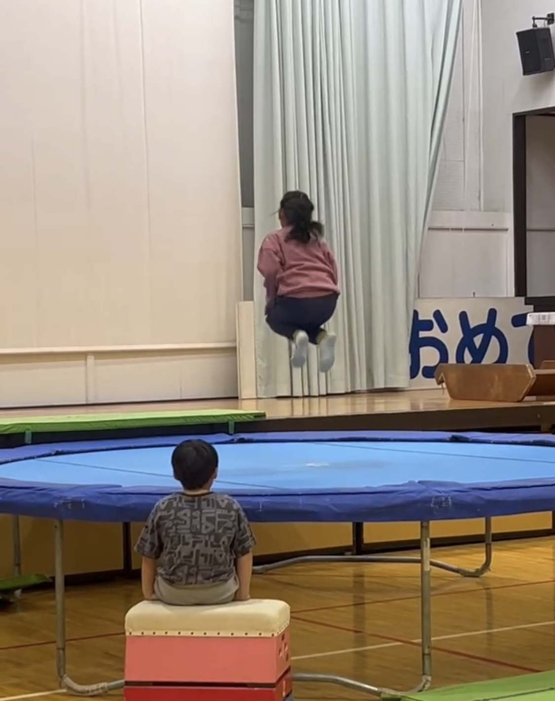 4mもある大きなトランポリン!また跳び箱、鉄棒、マットも練習をします。運動が得意なお子様も苦手なお子様も楽しく上達できるよう日々取り組んでいます。