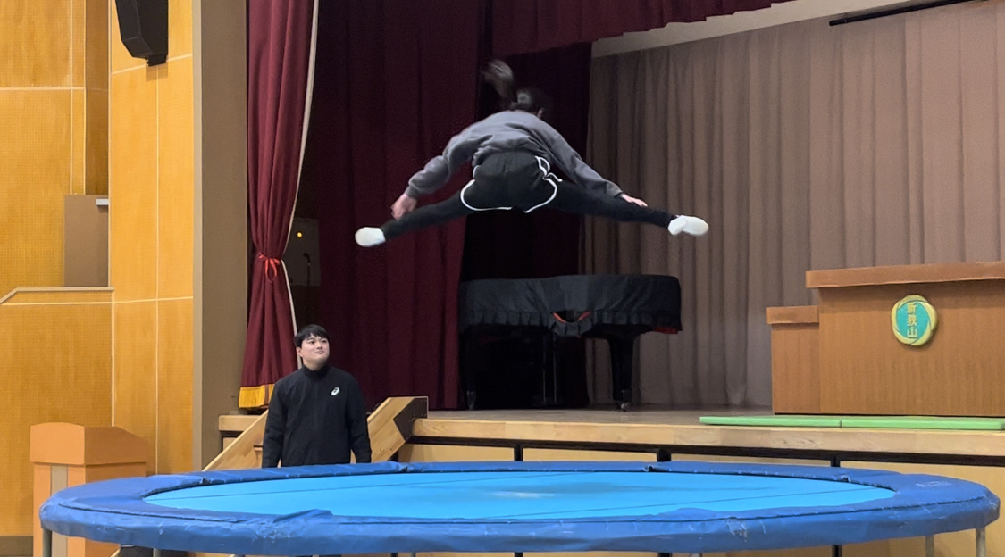 4mもある大きなトランポリン!また跳び箱、鉄棒、マットも練習をします。運動が得意なお子様も苦手なお子様も楽しく上達できるよう日々取り組んでいます。