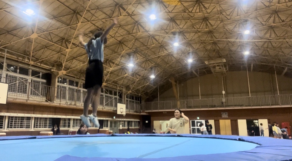 4mもある大きなトランポリン!また跳び箱、鉄棒、マットも練習をします。運動が得意なお子様も苦手なお子様も楽しく上達できるよう日々取り組んでいます。